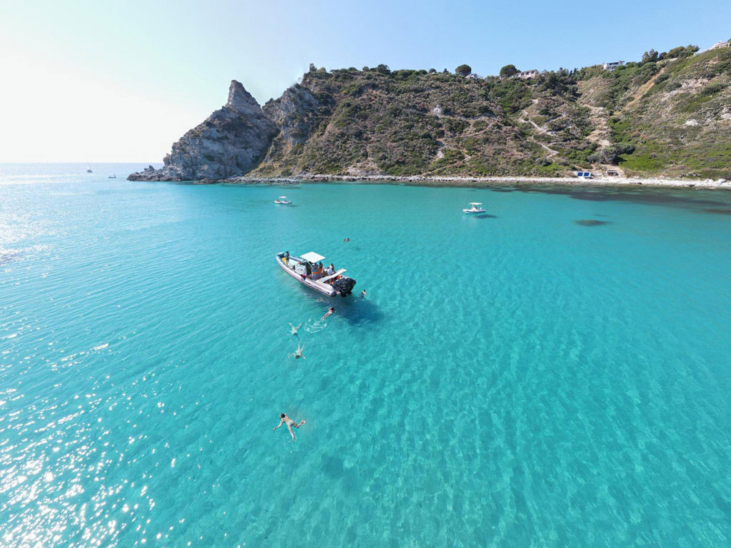 Arrêtez-vous dans les baies les plus belles et évocatrices aux eaux cristallines pour nager et faire du snorkeling parmi des centaines de poissons, explorez les petites criques de sable doré ; la mystérieuse grotte du squelette ; le canyon de Riaci ; la lagune de la cascade des pirates ; la splendide Praja di Fuoco, joyau caché parmi les criques du Cap Vatican ; la lagune turquoise de Grotticelle ; les vestiges du port romain de Forum Erculis ; admirez les anciennes habitations de Tropea, perchées sur la falaise, et nagez jusqu’à la grotte des amoureux de l’Isola Bella.